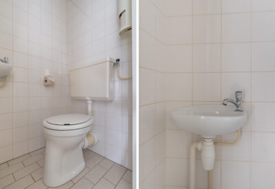 De badkamer en het separate toilet zijn functioneel en netjes betegeld. De badkamer is voorzien van een douche, wastafel en radiator. Ook hier is modernisering mogelijk, zodat je deze ruimtes helemaal naar jouw smaak kunt afwerken.