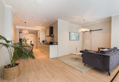De woonkamer voelt ruim en prettig aan, met voldoende plek voor een comfortabele zithoek. De afwerking is strak en modern, met een mooie doorlopende vloer en rustige kleurstelling.