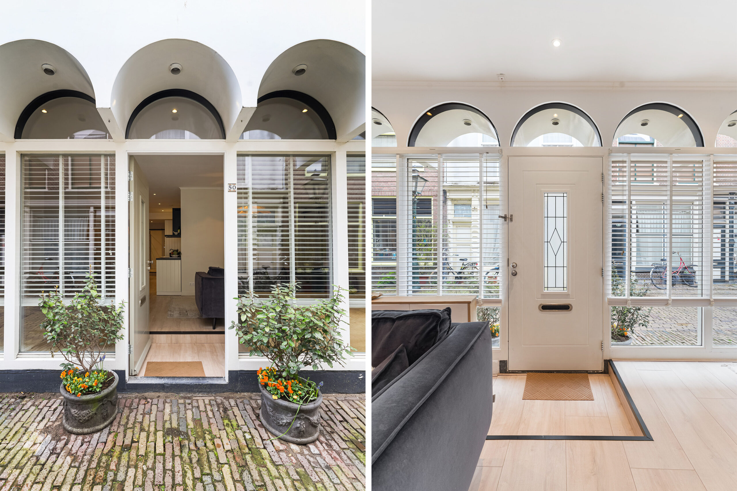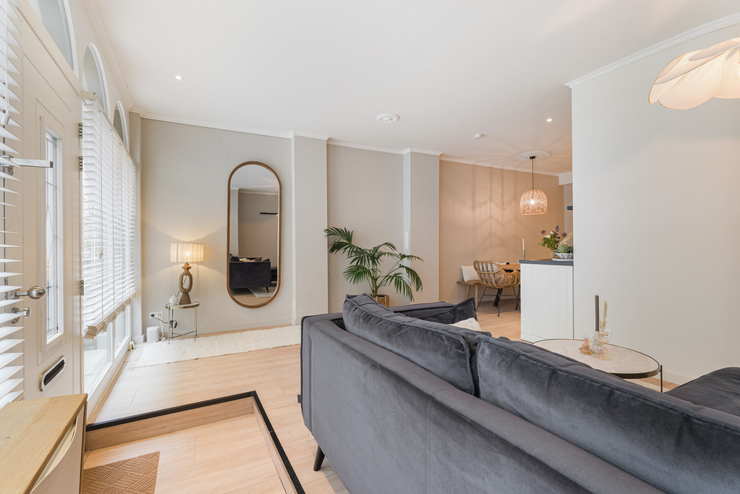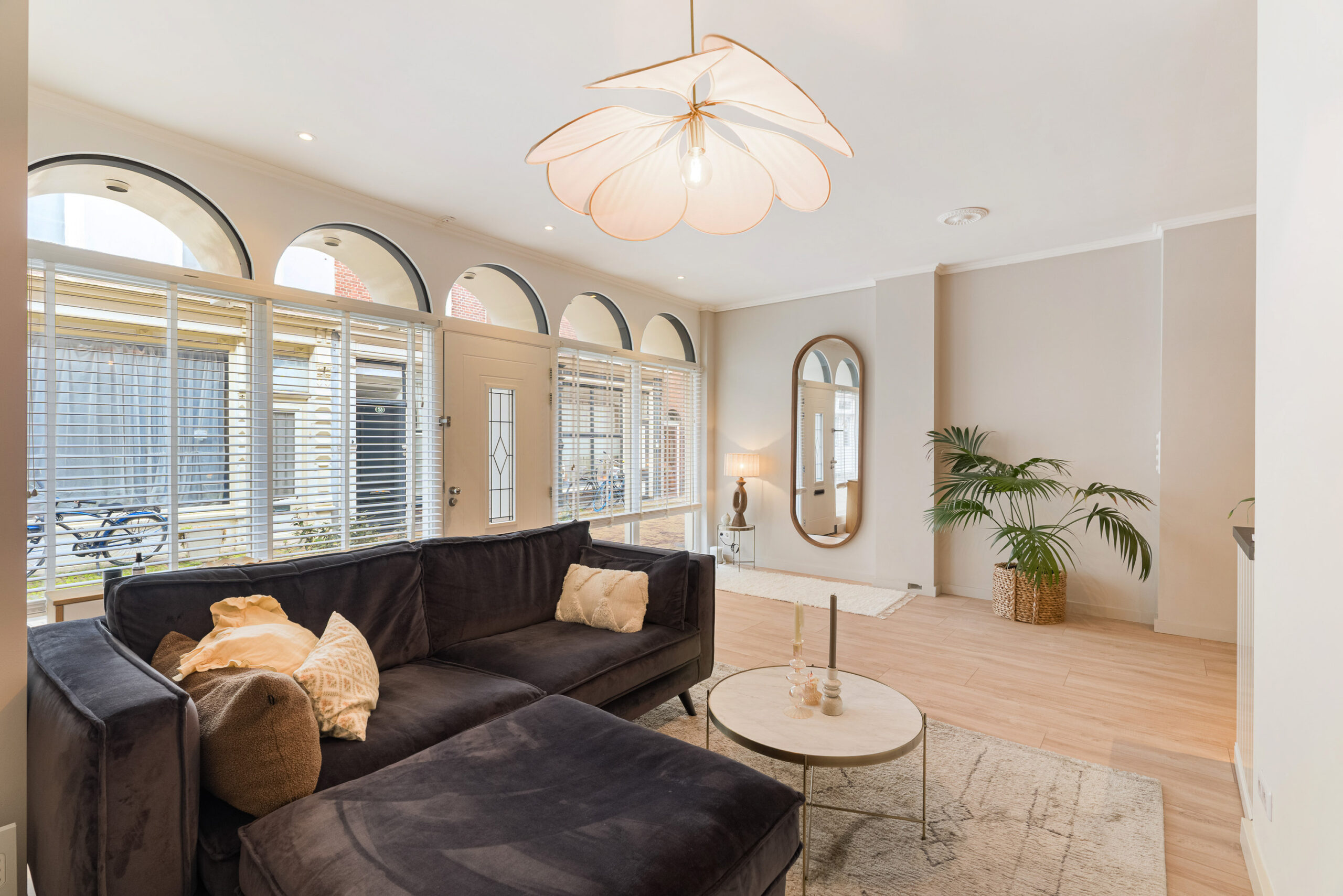 Wat deze woning direct onderscheidt, is de prachtige voorzijde met hoge ramen en karakteristieke rondbogen. Dit zorgt niet alleen voor veel lichtinval, maar geeft de woning ook een unieke en charmante uitstraling. Vanuit de woonkamer heb je zo ook leuk zicht op het straatje.