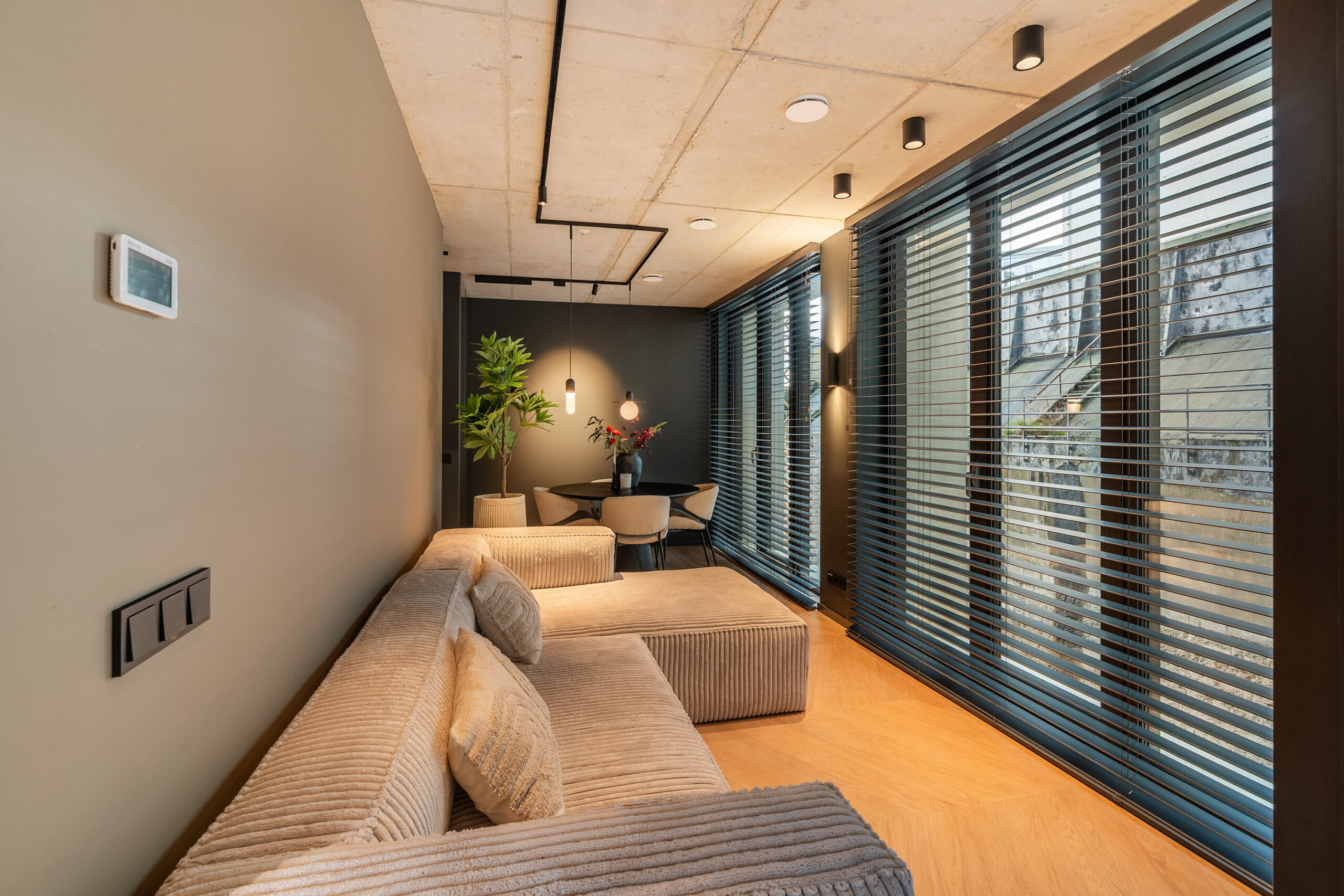 Het appartement heeft een woonoppervlakte van circa 50 m² en bestaat uit één open woonruimte, waarin wonen, koken, eten en slapen op een bijzonder slimme en stijlvolle manier samenkomen. De volledige afwerking is gerealiseerd onder ontwerp en toeziend oog van een binnenhuisarchitect. Dat zie je terug in elk detail: de maatwerk woon- en slaapwand in warm houtfineer, de strakke wandafwerking, de visgraat vloer, de zorgvuldig gekozen verlichting en de harmonieuze kleurstelling.