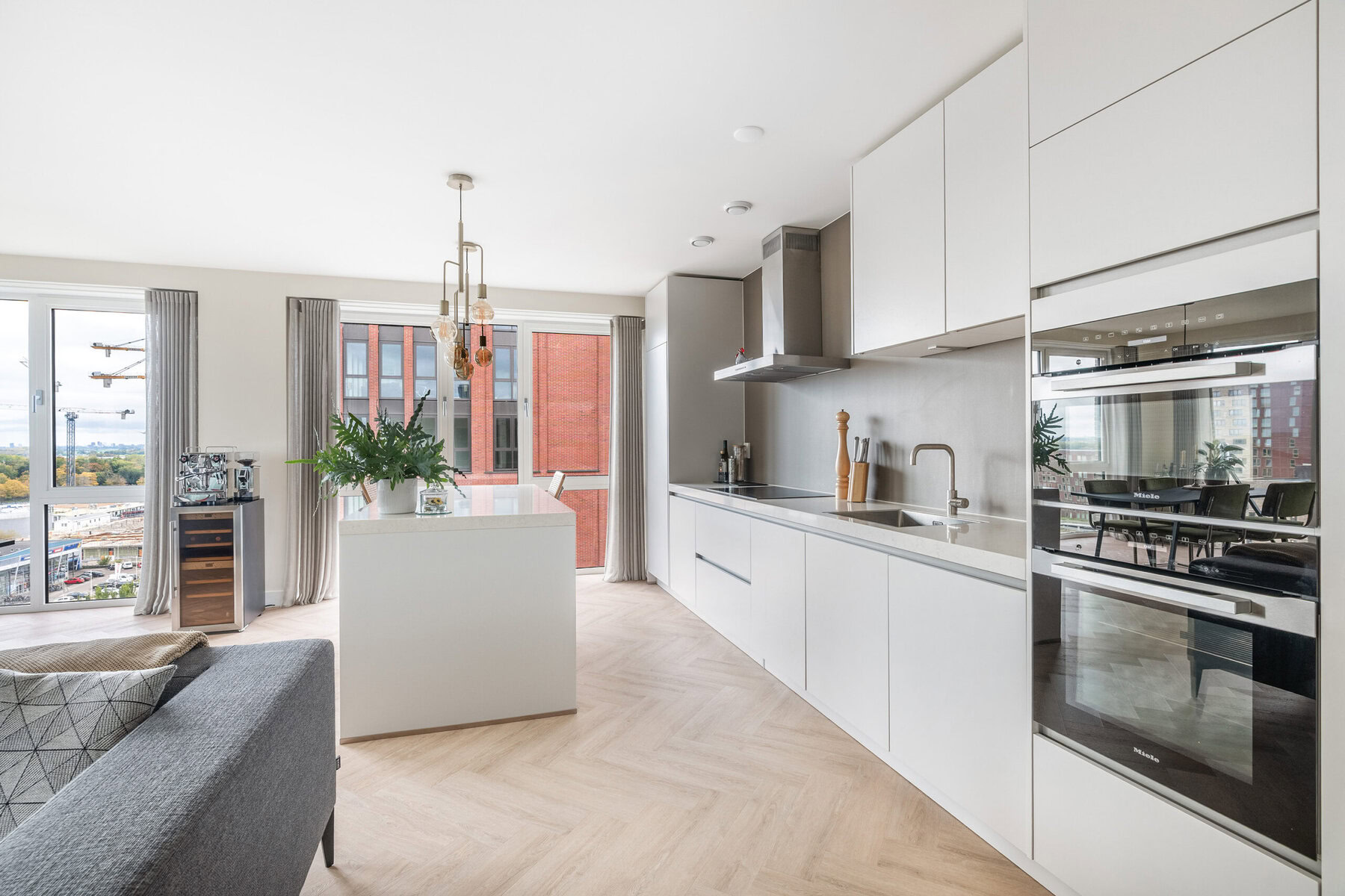 De open keuken is uitgerust met strak vormgegeven elementen en moderne Miele inbouwapparatuur, waardoor koken een plezierige ervaring wordt. De woning is voorzien van drie ruime slaapkamers en een multifunctionele ruimte die kan fungeren als wasruimte en/of bijkeuken. De badkamer is fris afgewerkt en voorzien van moderne voorzieningen die passen