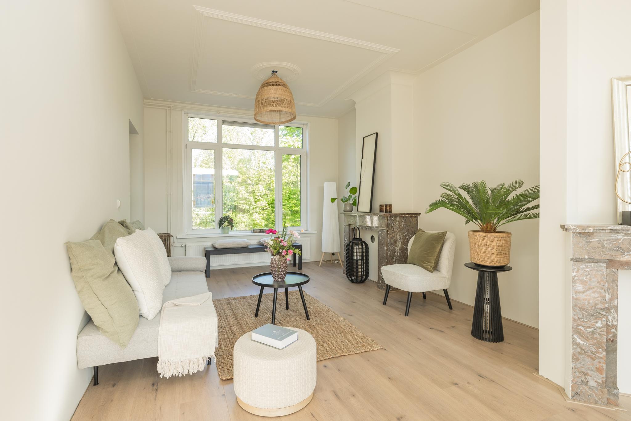 Via je eigen opgang kom je op de eerste verdieping in een heerlijk lichte doorzonwoonkamer, waar de voormalige en-suite indeling zorgt voor een mooie lengte en openheid. De hoge plafonds en grote raampartijen geven deze ruimte extra allure, terwijl de originele schouwen het karakter van de woning behouden. Een voormalige kleine kamer is bij de woonkamer getrokken en vormt nu een fijne werkplek of leeshoek met uitzicht op de levendige Morsweg.
