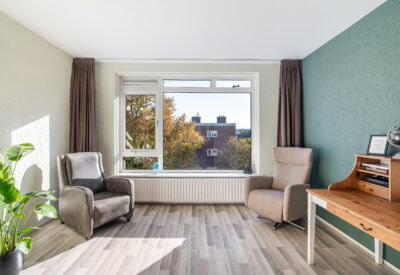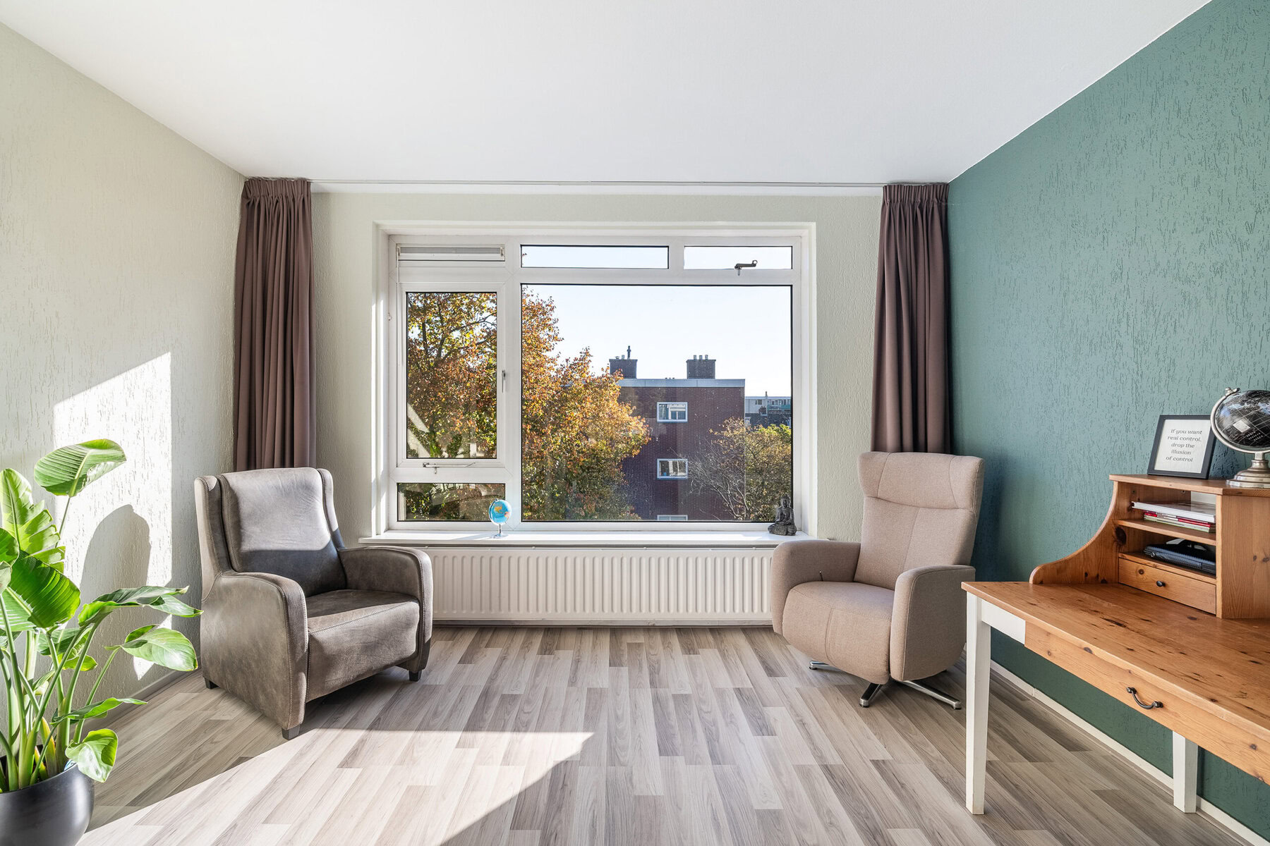 Grenzend aan de woonkamer ligt een tweede ruime kamer, nu ingericht als werkkamer/zitkamer. De praktische schuifdeuren zorgen voor een speelse en open verbinding met de woonkamer. Oorspronkelijk was deze kamer ook bereikbaar via de badkamer. Deze indeling kan, indien gewenst, eenvoudig weer hersteld worden.