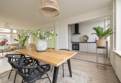 De open keuken, vernieuwd in 2026, sluit naadloos aan op de woonkamer en is uitgevoerd in een eigentijdse, rustige stijl met greeploze fronten, een donker werkblad en diverse inbouwapparatuur. Vanuit zowel de keuken als de woonkamer is er direct toegang tot het balkon, waardoor binnen en buiten op een natuurlijke manier in elkaar overlopen.