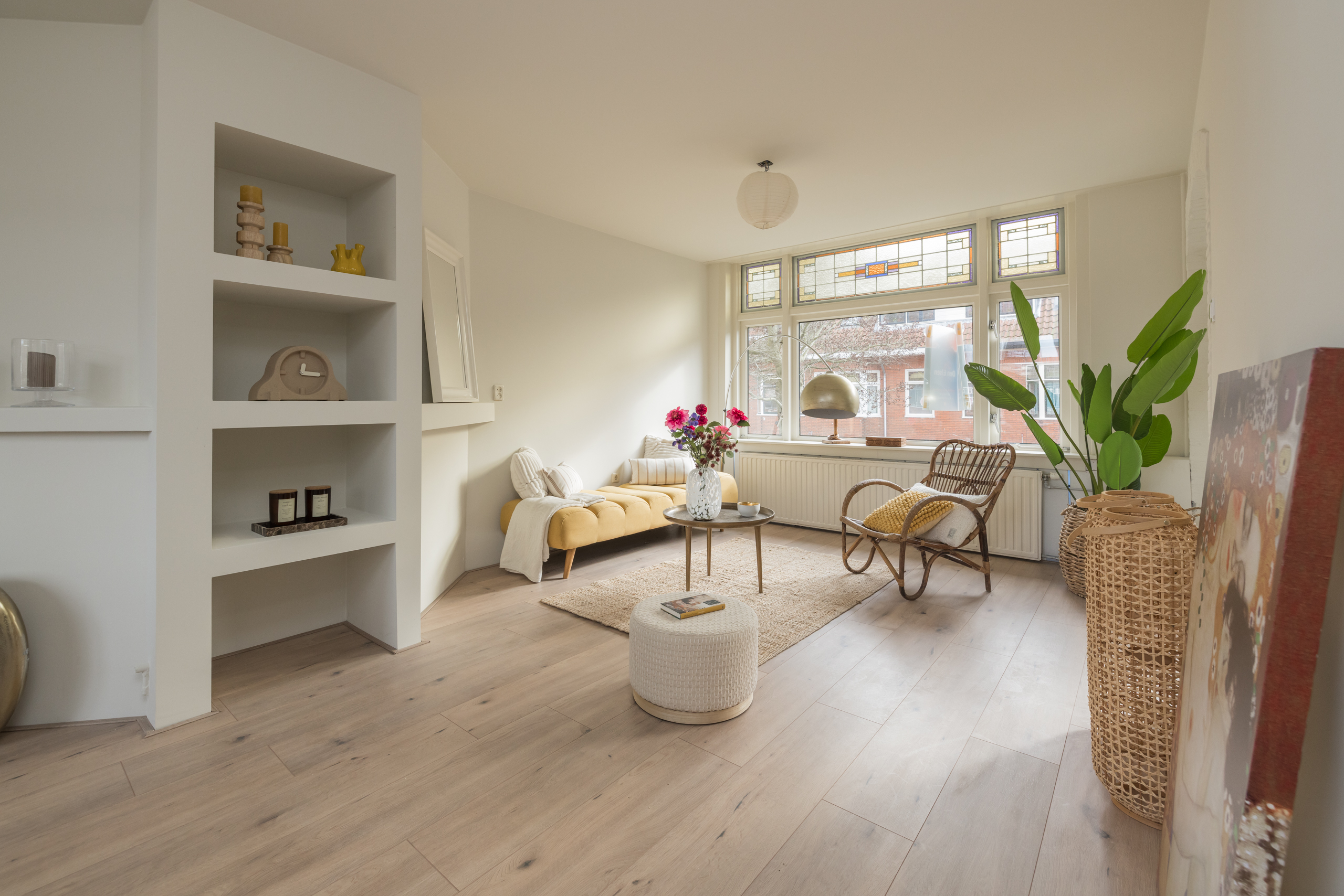 De woonverdieping vormt het hart van de woning en maakt direct indruk. De ruime woonkamer is heerlijk licht dankzij de grote raampartijen met karakteristieke glas-in-lood bovenlichten, die zorgen voor een warme en sfeervolle uitstraling. De strakke wandafwerking, lichte vloer en prettige plafondhoogte geven de ruimte een moderne en rustige basis.