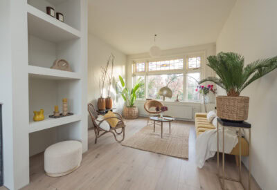 De woonverdieping vormt het hart van de woning en maakt direct indruk. De ruime woonkamer is heerlijk licht dankzij de grote raampartijen met karakteristieke glas-in-lood bovenlichten, die zorgen voor een warme en sfeervolle uitstraling. De strakke wandafwerking, lichte vloer en prettige plafondhoogte van circa 2,85 meter geven de ruimte een moderne en rustige basis.