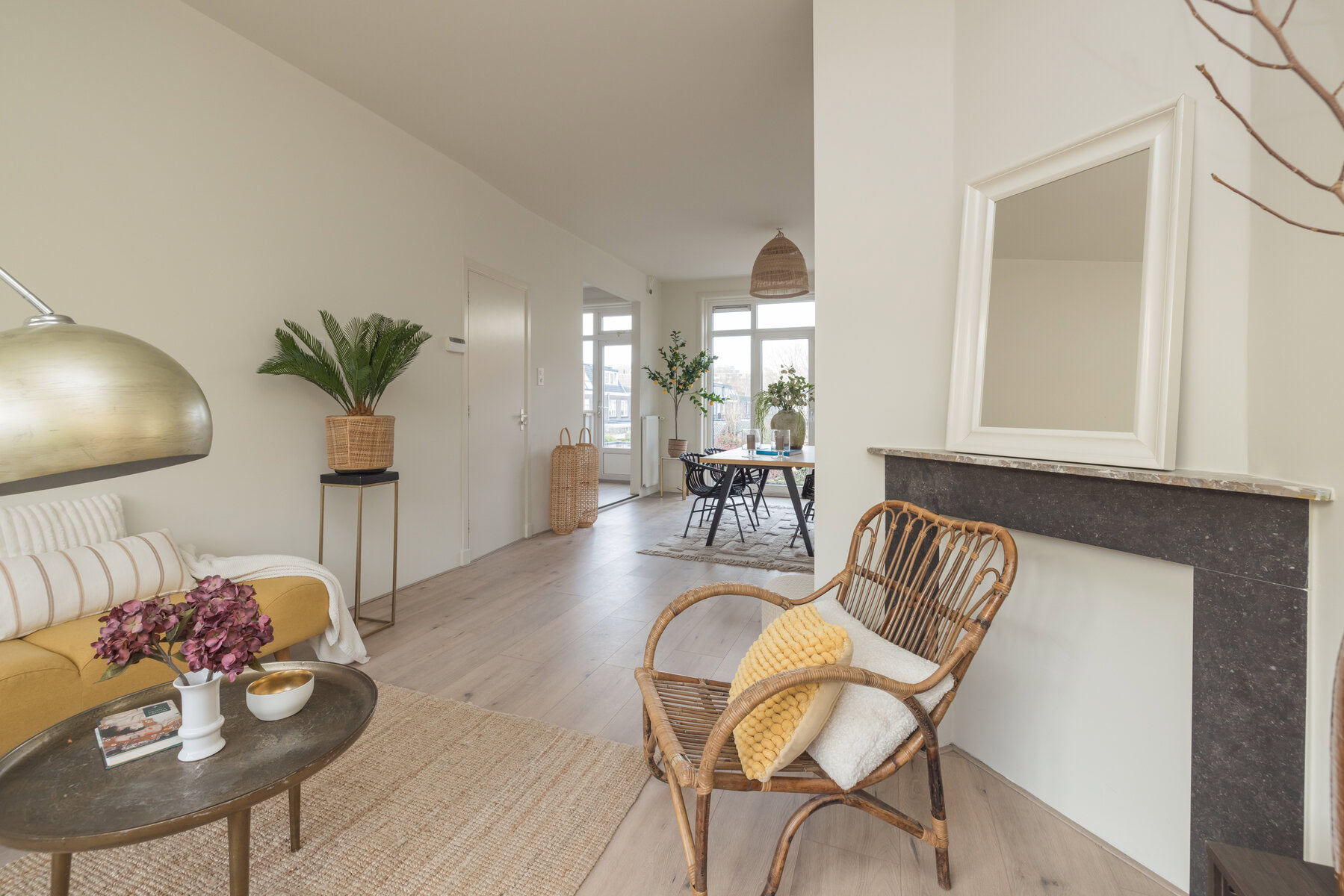 De woonverdieping vormt het hart van de woning en maakt direct indruk. De ruime woonkamer is heerlijk licht dankzij de grote raampartijen met karakteristieke glas-in-lood bovenlichten, die zorgen voor een warme en sfeervolle uitstraling. De strakke wandafwerking, lichte vloer en prettige plafondhoogte van circa 2,85 meter geven de ruimte een moderne en rustige basis.