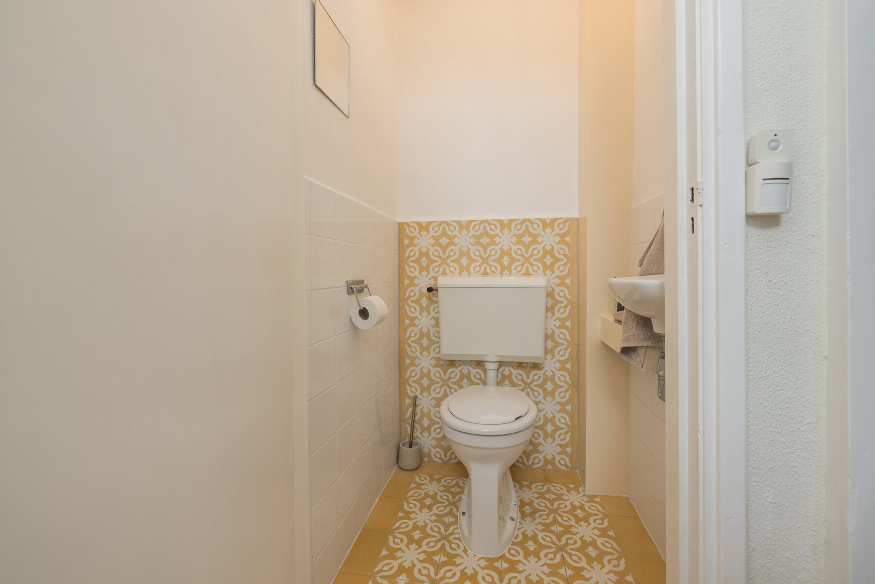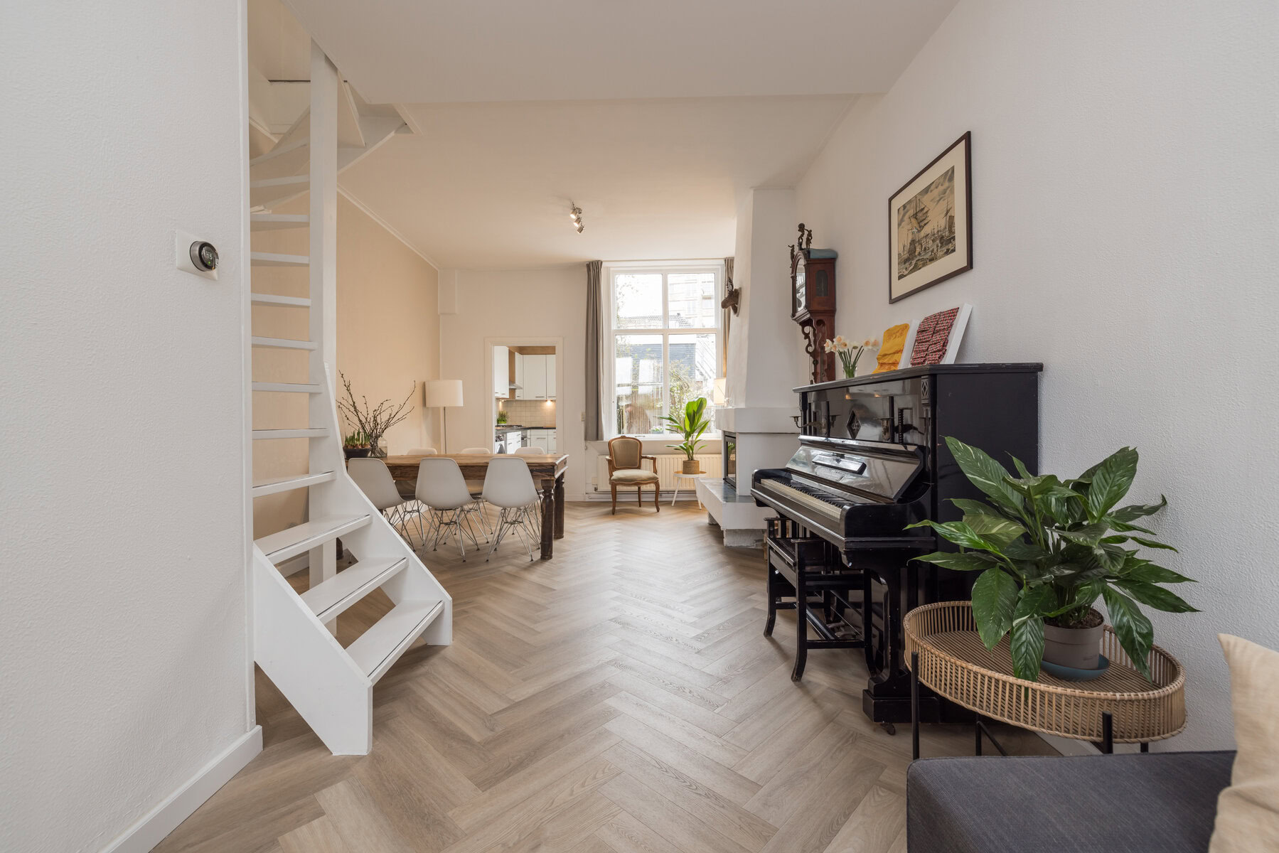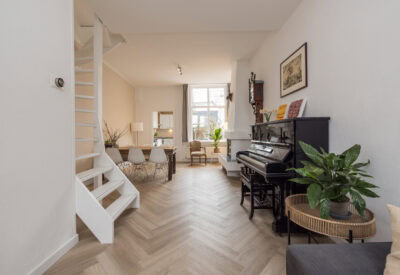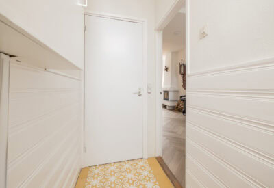 Via de entree kom je binnen in de hal met klassieke tegeltjes, meterkast en toiletruimte. Vanuit hier stap je de woonkamer in. Deze is opvallend licht en ruim, mede dankzij de plafondhoogte van ca. 3.04 meter. De ruimte is praktisch ingedeeld en biedt voldoende plek voor een comfortabele zithoek en een eettafel, een fijne plek om te ontspannen of gasten te ontvangen.