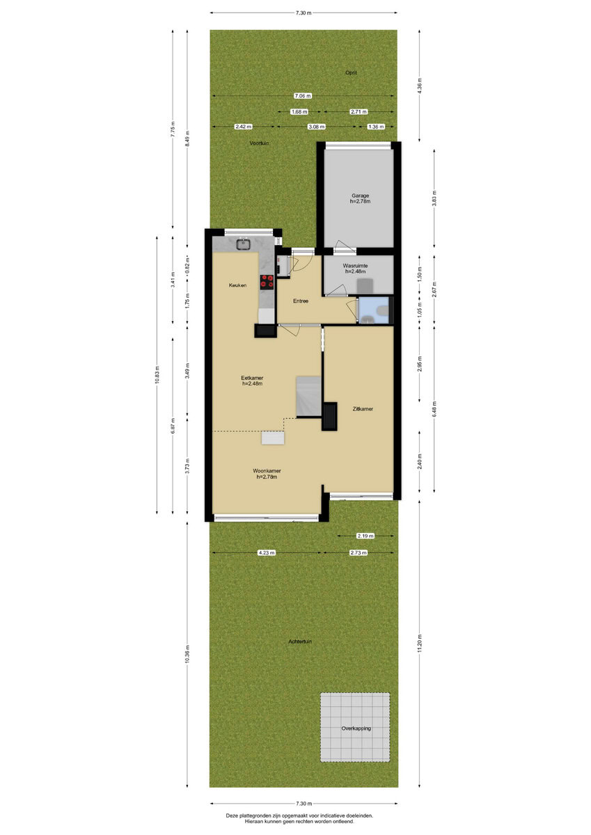 De garage ligt aan de voorzijde en is bereikbaar vanuit de hal en vanaf buiten. Een deel is ingedeeld als bijkeuken; het andere deel als garage met elektrische garagedeur. Op de oprit kunnen twee auto’s op eigen terrein worden geparkeerd.