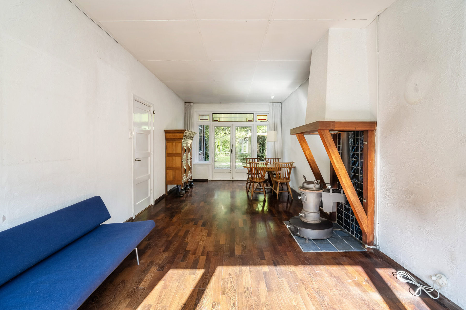 De woonkamer is heerlijk ruim en sfeervol, met openslaande deuren naar de tuin en een gaskachel (ter overname) als blikvanger. Aan de achterzijde ligt de keuken, geplaatst in een bestaande uitbouw, met directe toegang tot de tuin.