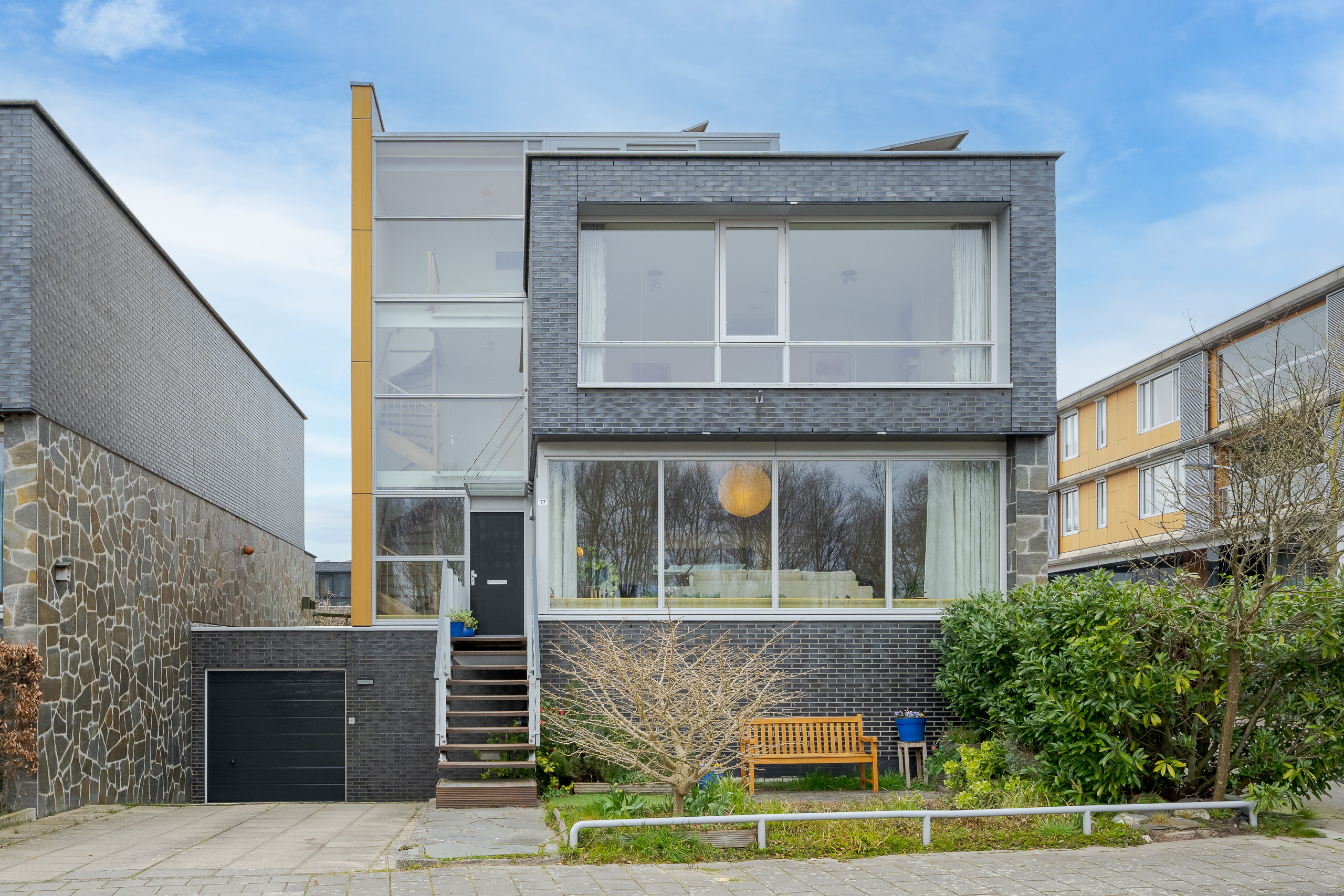 In Hofvliet 77 komen licht en ruimte samen verdeeld over 4 woonlagen met elk een eigen karakter. Deze architectonisch zeer uitzonderlijke woning heeft een riante glazen bovenetage met een riant uitzicht niet alleen op de Vliet, maar ook op de achterliggende Vlietlanden. Vanuit de grote schuifpui zijn ook in de verte de Wassenaarse duinen te zien en Den Haag. Hier beleeft u maximaal zon en licht met mogelijkheid een dakterras te realiseren.